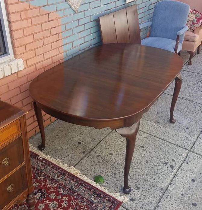 Mahogany traditional design nice base claw brass feet signed henkel harris measurements: #29 mahogany finish, shell carved knees, ball n claw carved feet, chippendale styling, matched grain top, cross banded border, silverware drawer ends, condition: 2427 us hwy 17, williamston, nc 27892. 2220 highway 70 se #220 hickory, nc 28602. Solid mahogany, queen anne style double pedestal table with 2 leaves and table pads, 6 fiddle back chairs: