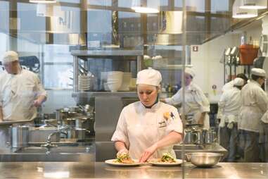 The restaurant's menu is seasonal and takes advantage of our very own herb and vegetable garden as well as fresh ingredients from the nearby green city market. I had the seared foie gras for the appetizer, lamb loin for the main entree and the flourless chocolate cake for… Chocolate marquise, summer berries, strawberry sorbet. The entire restaurant is operated by students as practical field work. The dining room is open for dinner service.